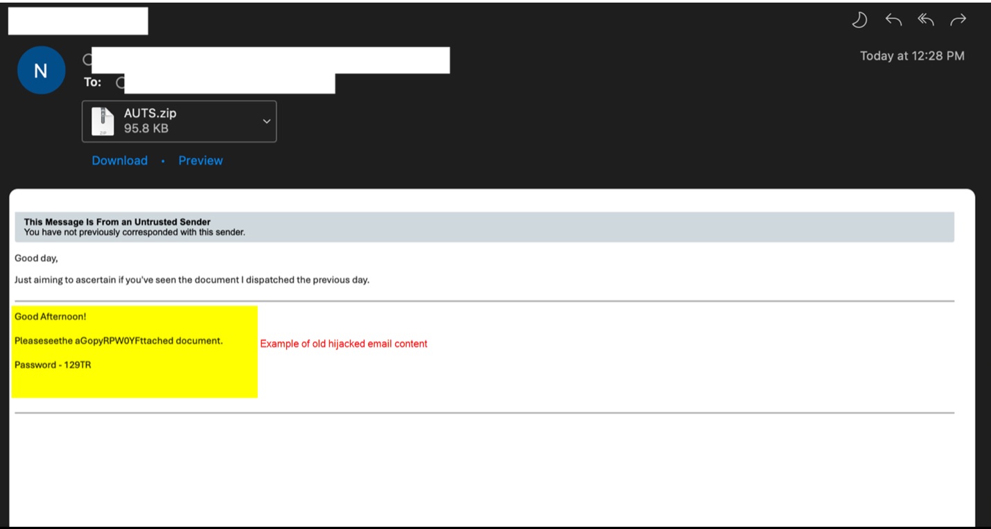La reciente campaña se inició mediante correos electrónicos de phishing que simulan ser respuestas a conversaciones previas del objetivo, empleando la táctica reconocida como secuestro de hilo.