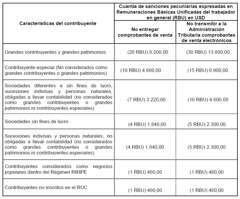 Mediante la resolución Nro. NAC-DGERCGC24-00000022, publicada el 10 de junio de 2024 en el Suplemento del Registro Oficial No. 575, se establecen las normas para aplicar sanciones de una a treinta remuneraciones básicas unificadas por la no entrega de comprobantes de venta y la no transmisión de comprobantes electrónicos al Servicio de Rentas Internas (SRI).