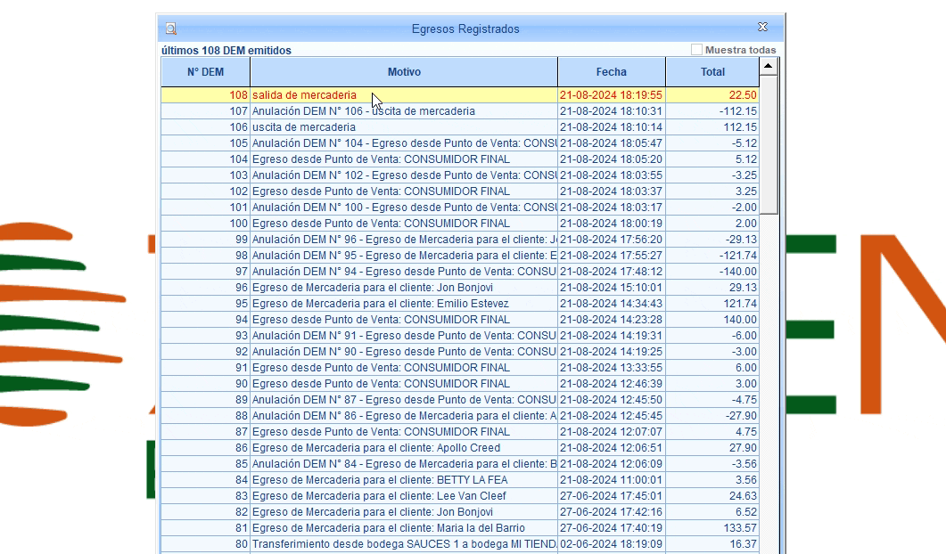 Primero, abre la lista de los Documentos de Egreso de Mercadería (DEMs) emitidos presionando el atajo de teclado F12.